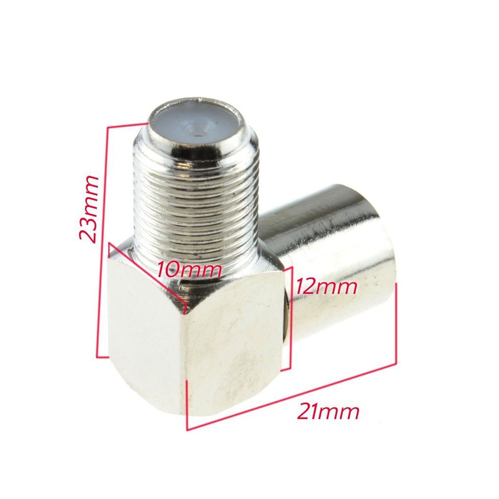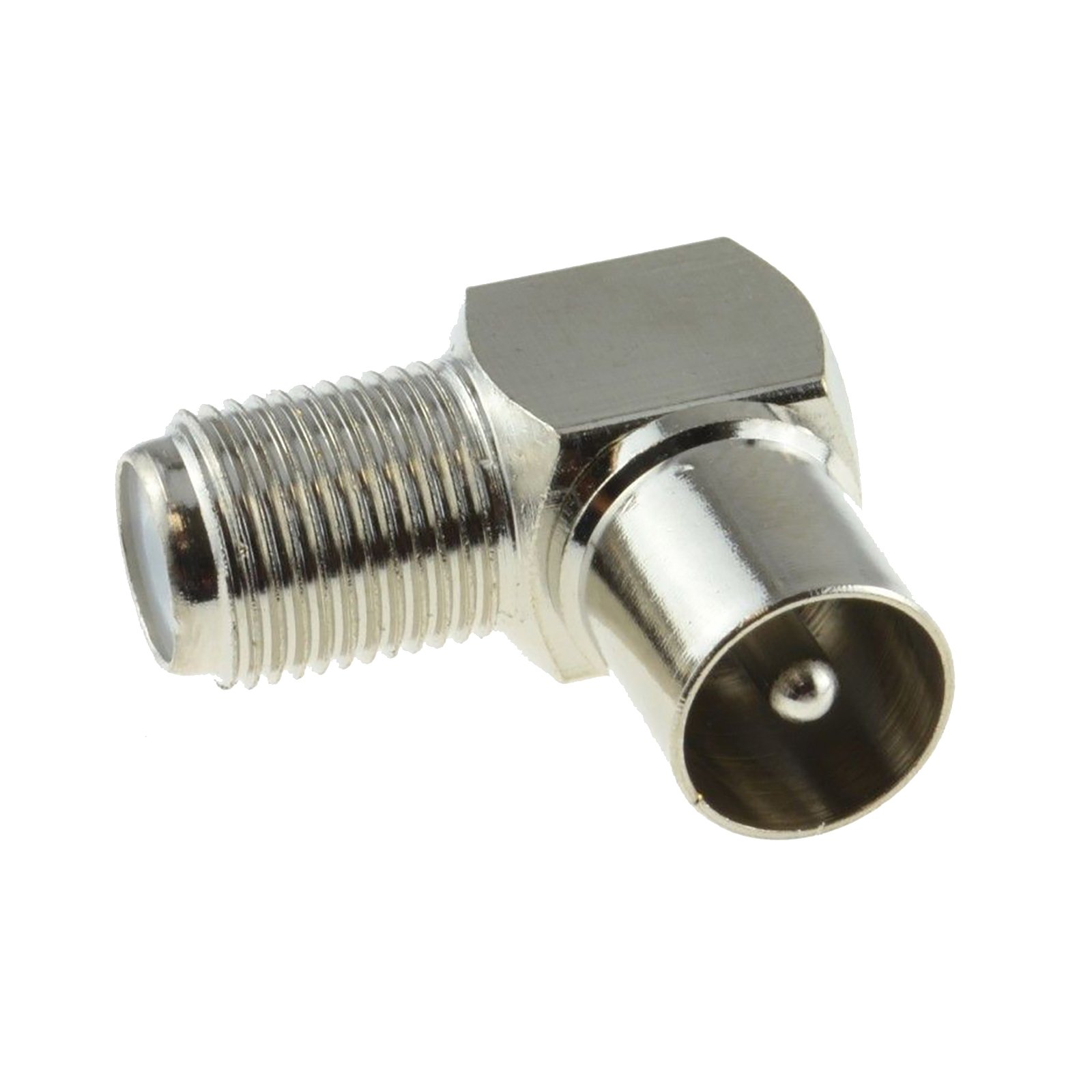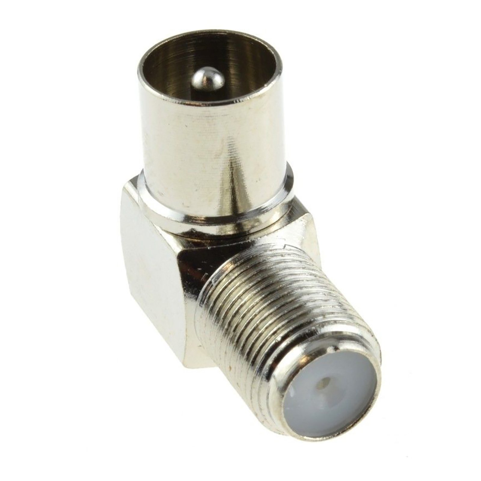 Right angle satellite F type (screw on) FEMALE socket connection to a RF MALE (push in) aerial adapter. Convert your F type Satellite connection into a MALE RF push in style connection (usually the connection for the back of your TV). Ideal for converting screw on connections to a MALE RF connection Small and compact design Nickel Plated All metal durable body RF Male plug F type Female Socket